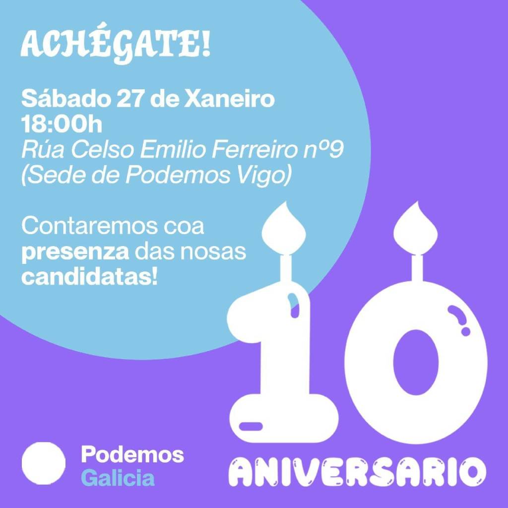 Hoxe sábado 27 de xaneiro ás 18:00 horas estarán as nosas candidatas ás eleccións ao parlamento galego na sede de Podemos Vigo, na rúa Celso Emilio Ferreiro, 9 onde celebraremos a nosa FESTA do 10º ANIVERSARIO de PODEMOS.