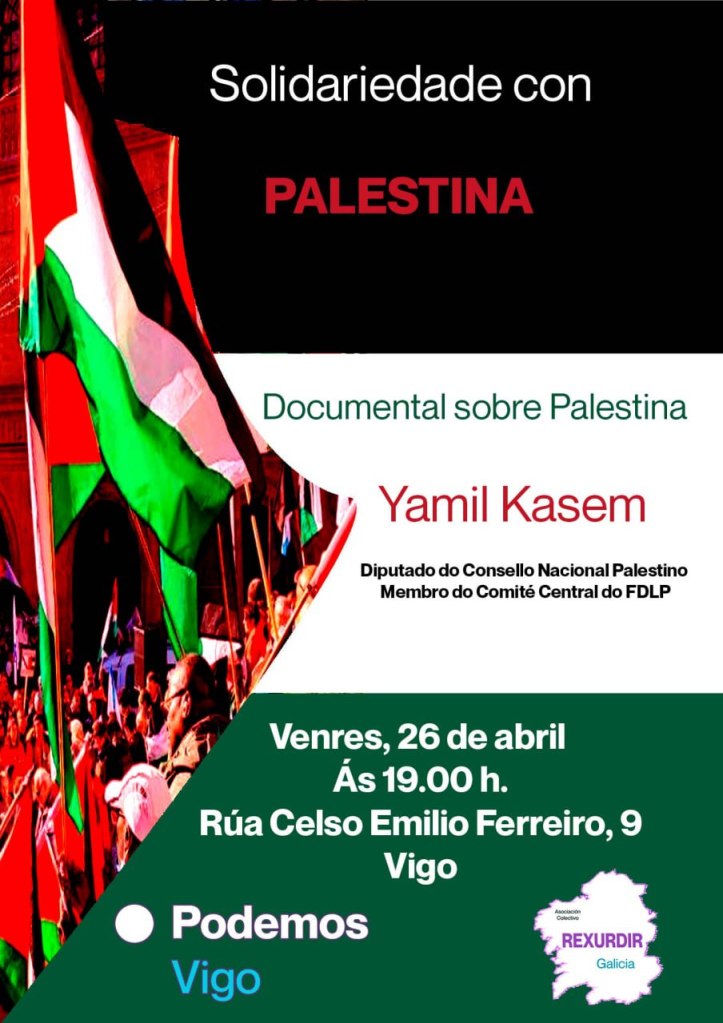 A Asociación Colectivo Rexurdir Galicia e Podemos Vigo comprácense en convidar a toda a cidadanía viguesa interesada a asistir á proxección do documental “El Dolor es Palestino” que terá lugar este venres 26 de abril de 2024 ás 19:00 horas na sede de Podemos Vigo, situada na rúa Celso Emilio Ferreiro, 9.